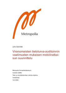 Insinöörityön tavoitteena on selvittää, miten viranomaisen turvallisuusauditoinnin hyväksyntään tähtäävä mobiiliratkaisu voidaan toteuttaa ottaen huomioon viranomaisten ja lainsäädännön asettamat tietoturvallisuuden velvoitteet. Työn tarkoitus on toimia tällaisen mobiiliratkaisun suunnittelun ja toteutuksen ohjeistuksena muun olennaisen dokumentaation ohella. Lisäksi työn tarkoitus on tuoda ohjelmistoratkaisun suunnittelijoille mukaan mobiilisovelluksille ainutlaatuisia näkökulmia.