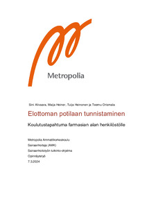 Opinnäytetyön tavoitteena oli lisätä farmasian alan opiskelijoiden sekä ammattilaisten tietoa ja taitoa rintakipuisen ja/tai elottoman potilaan tunnistamisesta, elvytyksen aloittamisesta sekä defibrillaattorin käyttöönotosta apteekin omaisessa ympäristössä.