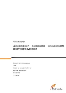 Opinnäytetyö-tutkimukseni tarkoituksena oli selvittää, miten lähiesimiehet kokevat oikeudellisen osaamisen työssään. Tutkimuksen lähtökohtina ja aihetta rajaavina tekijöinä olivat: oikeudellinen osaaminen, lähiesimiestyö ja kokemus. Tutkimus toteutettiin laadullisena tutkimuksena. Opinnäytetyöni tutkimusmetodina käytin Juha Perttulan fenomenologinen erityistiede- metodia. Tutkimusta varten haastattelin kuutta lähiesimiestä teemahaastattelulla. Haastattelemani henkilöt olivat kaikki naisia ja suurimmaksi osaksi he työskentelivät sosiaali- ja terveydenhuollon lä-hiesimiestehtävissä. Analysoin haastattelumateriaalin fenomenologisen erityistieteen- metodin 14- vaiheisen analysointisysteemin mukaisesti. Analyysin pohjalta tärkeiksi sisältöalueiksi muodostuivat mm. kokemus koulutuksen ja työkokemuksen merkityksestä sekä perehdytyksestä, kokemus vallasta, vastuusta ja luottamuksesta, kokemus ajankäytöstä ja tukikanavista ja kokemus työn vaativuudesta ja ajankäytöstä. Lähiesimiehen odotettiin työn vastaanottaessaan hallitsevan lähiesimiestyössä tarvittavan juridisen tiedon. Kenenkään ammatilliseen koulutuksen sitä ei ollut kuitenkaan kuulunut. Oppia ja tietoa he olivat saaneet erilaisten kurssien kautta sekä työkokemuksen kautta. Työhön perehdyttäminen oli puutteellista, eikä omaa oikeudellisen osaamisen tasoa ei koettu riittäväksi. Tärkeimmiksi tukikanaviksi koettiin kollegat, oma esimies ja mahdollinen organisaation HR-yksikkö. Lähiesimiestyö koettiin erittäin vaativaksi ja vastuulliseksi. Yleisesti koettiin myös, että hallinnollisen työn osuus korostuu ajallisesti niin voimakkaasti, että varsinaiselle lähijohtamiselle ei jää tarpeeksi aikaa. Lähiesimiehet ilmaisivat huolestuneisuutta ja pelkoa siitä, että on olemassa sellaisia oikeudellisia asioita, joista he eivät ole edes tienneet, että heidän pitää tietää!