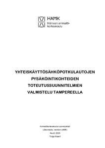 Tämän opinnäytetyön tavoitteena oli valmistella yhteiskäyttösähköpotkulautojen pysäköintikohteiden toteutussuunnitelmia Tampereen keskusta-alueelle. Markkinaehtoisesti toimivien sähköpotkulautojen yleistyessä Tampereella, on merkittävimmäksi haasteeksi ilmaantunut vapaan pysäköinnin aiheuttama haitta julkisilla paikoilla. Sähköpotkulautojen asemattomuus, eli pysäköinnin vapaus on tunnistettu ongelmalliseksi. Tämänhetkinen pysäköintiverkosto on todettu puutteelliseksi ja tähän ratkaisuksi on suunniteltu pysäköintipaikkojen toteutus, minkä avulla on mahdollista ohjata sekä rajoittaa pysäköintiä.