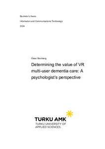 Dementia is a neuro-debilitating disease that affects more than 55 million people worldwide, with an additional 10 million cases reported each year. While the rise in dementia prevalence has led to a technological revolution in dementia care, most devices are patient-centric wearables or mobile applications. Very little work is done to investigate the potential of caregiver-centric technology and even less focus is on technology that centers both the patient and caregiver. This study tests the potential value of using of a multi-user VR application whereby both the caregiver and patient can be present in the same virtual world. This research collected qualitative data of the application’s potential through semi-structured interviews with four practicing psychologists. The results from the interviews indicate that the multiplayer aspect would be particularly useful in cases where reminiscence theory is applied. Furthermore, it would be useful if: (a) the application could toggle the virtual doctor between active participant and silent invisible observer; and (b) collect data from the patient’s virtual engagement and movement. All participants were concerned that VR requires a high-level of onboarding and that dementia sufferers would face much greater difficulties with this than regular users. This study concludes that multi-player VR dementia care has potential under certain use cases but requires significant advances in device usability before VR head mounted displays can truly be considered a feasible dementia care technology. Dementia on neuroottisesti heikentävä sairaus, josta kärsii noin 55 miljoonaa ihmistä maailmanlaajuisesti. Noin 10 miljoonaa uutta dementia tapausta havaitaan vuosittain. Vaikka Dementian ilmaantuvuus ja yleisyys on johtanut teknologian hyödyntämiseen hoidossa, ratkaisut ovat potilaskeskeisiä kannettavia laitteita tai puhelinsovelluksia. Hoitajakeskeistä teknologiaa ei ole tutkittu riittävästi. Vielä vähemmän on tutkittu sekä potilas- että hoitajakeskeisiä ratkaisuja. Tämän työn tarkoitus on tutkia monikäyttäjäsovelluksen käytön mahdollista lisäarvoa sovelluksessa, jossa hoitaja ja potilas ovat samanaikaisesti virtuaalimaailmassa. Tutkimusta varten kerättiin tietoa puolirakenteisin haastatteluin neljän psykologin kanssa. Haastattelua ennen he kokeilivat VR-sovellusta joko VR-laitteella tai yhdessä tapauksessa vinjetointitekniikalla. Lopputulokset näistä haastatteluista osoittavat, että monikäyttäjämuoto voi olla erityisesti hyödyllinen tapauksissa, joissa muistoteoriaa ”reminiscence theory” voidaan soveltaa. Lisäksi tohtorin läsnäolo skenaariossa ei ole aina toivottava kaikissa käyttötapauksissa. Mahdollisuus vaihtaa aktiivisen osallistujan kanssa sekä hiljaisen tarkkailijan välillä voi olla hyödyllistä. Osallistuvat psykologit kertoivat, että tiedon kerääminen potilaiden virtuaaliosallistumista ja liikkumisesta on merkittävä hyöty VRmonikäyttäjäsovelluksen käytöstä dementian hoidossa. Suurin osallistujien murheista oli, että VR-sovelluksen käyttö vaatii suurta perehdytystä ja ne, jotka kärsivät dementiasta kohtaisivat huomattavasti enemmän vaikeuksia kuin normaalikäyttäjä. Tämä tutkimus osoittaa, että dementian hoidossa VRmonikäyttäjäsovelluksella on potentiaalia erityisissä olosuhteissa. Laitteiden käyttäjäystävällisyyden pitää kehittyä huomattavasti ennen kuin VR-laitteen kaltaista päässä kannettavaa näyttöä voidaan vakavasti harkita mahdollisena dementian hoitoteknologiana.