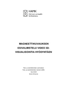 Tämän opinnäytetyön lopputuloksena syntyi magneettikuvaukseen esivalmistelu video 3D-visuaalisuutta ja animaatiota hyödyntäen. Videota voidaan hyödyntää magneettikuvauksen esivalmistelun nopeuttamiseen ja magneettikuvauksen esivalmistelun tietoisuuden lisäämiseen. The purpose of the work was to create visual presentation for the preparation of the magnetic resonance imaging (MRI) to be presented for before magnetic the examination. The purpose of the visual presentation was to facilitate the preparation of the situation from the point of view the radiographer, customer and the personnel outside of the imagining unit. The goal of the work was to achieve time and resources saving visual presentation using 3D visualization. A further goal of the work was to find out a functional uniform looks for the instructional video and present all the steps, taking into account the limiting factors.