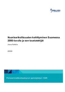 Tässä opinnäytetyössä on selvitetty, miten nuorisorikollisuus on kehittynyt Suomessa 2000-luvulla, ja minkälaisia tekijöitä sen taustalla vaikuttaa. Tutkimuskysymykset ovat 1) Miten nuorisorikollisuus on kehittynyt määrällisesti Suomessa 2000-luvulla? 2) Minkälaiset tekijät vaikuttavat nuorten rikollisuuden taustalla? Tutkimus on toteutettu kirjallisuuskatsauksena ja siinä on käytetty lähteinä Tilastokeskuksen tuottamia tilastoja rikollisuudesta sekä nuorisorikollisuuteen liittyviä artikkeleita ja tutkimuksia.
