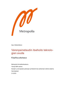 Opinnäytetyön tarkoituksena oli selvittää verenpainetaudin itsehoitoa teknologia avulla. Tavoitteena oli lisätä tietoisuutta verenpainetaudin itsehoidosta teknologian avulla. Tutkimuskysymykset olivat 1) Millaista teknologiaa verenpainetaudin itsehoidossa käytetään ja 2) Miten teknologiaa voidaan hyödyntää verenpainetaudin itsehoidossa.