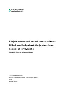 Kirjallisuuskatsauksen tulosten perusteella yhteys lähijohtajan hyvinvoinnilla ja pitovoimalla on, mutta tätä on katsottava laajasti ja myös monimutkaisesti. Suoraviivaista polkua ei ole ja onkin ymmärrettävä, että hyvinvointi jo itsessään on laaja käsite, joka pohjautuu niin yksilöstä nousevista, kun ulkoisista tekijöistä. Punaisena lankana mukana olleissa tutkimuksissa nousee lähin esihenkilö, minkä takia johtopäätöstä siitä, että johtamisella on väliä suhteessa pitovoimaan, on ilmeinen ja tämän kautta lähijohtajan hyvinvoinnilla on merkitystä, koska se vaikuttaa tutkimusten mukaan siihen, miten hän johtaa. The social and health sector is one of the sectors that is in a constant state of change. The pace of change is high and the scope and impact of change in the sector is great. In Finland, as in many other countries, there is a growing shortage of workers as the population ages. There is a need to improve the attractiveness of the sector, but it is also important to improve the retention. The wellbeing of the manager is a concern in the midst of change, as the manager is in the forefront of change.