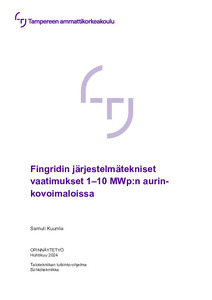 Opinnäytetyö tehtiin Finnwind Oy:lle, joka on suurten aurinkovoimaloiden rakentamiseen ja suunnitteluun erikoistunut teknologia- ja asiantuntijayritys. Yritys on erikoistunut 1–10 MWp:n maa-asenteisiin aurinkovoimaloihin. Opinnäytetyön tarkoituksena oli käsitellä kantaverkkoyhtiö Fingrid Oyj:n voimalaitosten järjestelmäteknisiä vaatimuksia, jotka koskevat 1–10 MWp:n aurinkovoimaloita. Työssä selvitettiin myös mahdollisia ratkaisuja aurinkovoimalan ja Fingridin väliseen tiedonvaihtoon.
