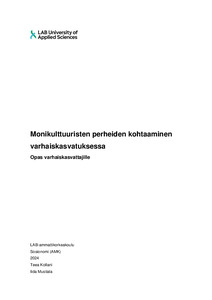 Kasvavan maahanmuuton myötä on yhä yleisempää, että päiväkodeissa kohdataan eri kulttuuritaustoista tulevia perheitä. Monikulttuuristen perheiden kanssa työskennellessä varhaiskasvattajille voi syntyä tarve löytää uusia menetelmiä yhdenvertaisuuden toteutumiseksi ja perheiden osallisuuden lisäämiseksi. Toiminnallisen opinnäytetyön tarkoituksena oli toteuttaa yhteistyökumppanina toimineen päiväkodin henkilöstölle opas monikulttuuristen perheiden kohtaamisen avuksi. Oppaan tavoitteena oli lisätä varhaiskasvattajien valmiuksia työskennellä monikulttuuristen perheiden kanssa.