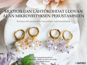 Osana opinnäytetyötä suunniteltiin käsintehtyjen lasihelmikorvakorujen tuoteperhe, jota koemyytiin viidessä eri myyntikanavassa. Koemyyntijaksoa raportoitiin neljän kuukauden ajalta, vuoden 2023 syyskuusta joulukuuhun. Opinnäytetyössä selvitettiin, mitä asioita muotoilijan on otettava huomioon aloittaakseen omien tuotteiden koemyynnin ja saadakseen myynnistä mahdollisimman paljon irti. Aihetta tutkittiin henkilökohtaisten kokemusten havainnoinnin sekä aineistoanalyysin avulla. Tutkimustulosten ja tärkeimpien havaintojen pohjalta koottiin visualisoitu, tiivis opas luovan alan mikroyrityksen perustajalle koemyynnin aloittamiseen.
