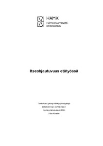 Opinnäytetyössä tutkitaan, millaiset asiat mahdollistavat mutta myös haittaavat yksilön itseohjautuvuuden toteutumista etätyössä sekä itseohjautuvuuden merkitystä työssä oppimiseen ja osaamisen kehittymiseen. Tutkimukseen kohdeorganisaationa on Suomen Osuuskauppojen Keskuskunnan majoitus- ja ravitsemiskaupan ketjuohjauksen myyntipalvelu. Organisaatiossa työskentelee 160 myynnin ja asiakaspalvelun ammattilaista neljällä eri paikkakunnalla. Työn pääsääntöisenä organisoimismallina on hybridityö. Kohdeorganisaatiolla on mahdollisuus käyttää tutkimuksessa saavutettuja tuloksia ja niistä tehtyjä johtopäätöksiä hyväksi liiketoiminnan kehittämisessä niin työn organisoinnin kuin johtamisen näkökulmasta. Tutkimuksella vastataan seuraaviin tutkimuskysymyksiin: Millaiset asiat mahdollistavat yksilön itseohjautuvuuden toteutumista etätyössä? Mikä merkitys itseohjautuvuudella on työssä oppimiselle ja osaamisen kehittymiselle etätyön kontekstissa?