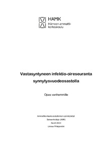 Tämän opinnäytetyön tarkoitus oli kerätä aikaisempaa tutkittua tietoa vastasyntyneen infektioista, niiden syntyyn vaikuttavista tekijöistä, oireista, seurannasta sekä hoidosta. Tilaajana toimii Kanta-Hämeen keskussairaalan synnytys- ja naistentautien yksikkö. Opas tulee käyttöön synnyttäneiden vuodeosastolle, jossa opas annetaan osastolle saapuessa jokaiselle infektio-oireseurantaa tarvitsevan vauvan vanhemmalle.