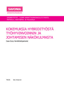 Opinnäytetyössä tutkittiin Eezy Henkilöstöpalveluiden henkilöstön kokemuksia hybridityön tekemisestä. Kokemuksia hybridityöstä tutkittiin etenkin työhyvinvoinnin ja johtamisen näkökulmasta. Työn tavoitteena oli selvittää millaisena työnteon mallina henkilöstö kokee hybridityön tekemisen. Tavoitteena oli erityisesti selvittää kuinka henkilöstö kokee hybridityön johtamisen ja kuinka hybridimallin mukainen työntekeminen on vaikuttanut henkilöstön työhyvinvointiin.