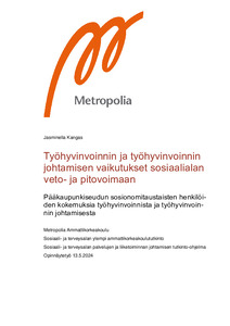 Sosiaali- ja terveysalan veto- ja pitovoimaa tulee kehittää, sillä henkilöstövaje sosiaali- ja terveysalalla on kasvamassa. Samaan aikaan mielenterveyteen liittyvät pitkät sairauspoissaolot ovat lisääntyneet Suomessa viime vuosien aikana. Työhyvinvoinnin tukeminen on yksi keino lisätä hyvinvoinnin kokemusta työssä, pienentää sairauspoissaoloihin liittyviä kuluja sekä lisätä veto- ja pitovoimaa. YAMK-opinnäytetyön tarkoituksena oli kartoittaa, miten pääkaupunkiseudulla toimivat sosionomit kokevat työhyvinvoinnin ja työhyvinvoinnin johtamisen sosiaalialalla, ja että onko työhyvinvoinnilla sekä sen johtamisella vaikutusta työn veto- ja pitovoimaan. Tässä työssä pyrittiin tuomaan erityisesti sosiaalialan ja sosionomien äänet kuultavaksi. Tavoitteena oli myös tuoda työnantajille tietoa siitä, miten he voivat kehittää työhyvinvoinnin johtamistaan, jotta työn veto- ja pitovoima lisääntyisi. Tutkimuskysymykset opinnäytetyössä olivat: ”Millaisia kokemuksia sosionomeilla on työhyvinvoinnin johtamiseen liittyen sosiaalialalla?” sekä ”Mitkä työhyvinvoinnin ja sen johtamisen tekijät vaikuttavat työn veto- ja pitovoimaan?”. Laadullisen tutkimuksen menetelmää, teemahaastattelua, käytettiin aineiston keräämiseksi ja ainestoa analysoitiin aineistolähtöisen sisällönanalyysin avulla. Haastatteluihin osallistui 12 vapaaehtoista pääkaupunkiseudulla työskentelevää sosionomia. Tulosten perusteella työhyvinvoinnilla ja työhyvinvoinnin johtamisella on merkitystä ja vaikutusta työn veto- ja pitovoimaan. Ihmisten johtamisosaamista kaivattiin erityisesti, mutta myös asioiden johtamisosaamisella oli merkitystä niin hyvinvoinnin kokemukseen kuin työn veto- ja pitovoimaan. Tulokset olivat samansuuntaisia aiempien tutkimusten ja kirjallisuuden kanssa. Työnantajien tulisi kiinnittää huomiota työhyvinvointiin sekä sen johtamiseen, jos työn veto- ja pitovoima halutaan säilyttää tai lisätä. Sosiaalialalla henkinen kuormittavuus voi olla suurta, minkä vuoksi olisi hyvä tutkia tulevaisuudessa, millaisia hyvinvoinnin taitoja sosionomeilla on käytettävissään. Myös iän vaikutusta työntekijöiden tarpeisiin ja toiveisiin, sekä yhteiskunnan tulevien muutosten vaikutukset työn veto- ja pitovoimaan voivat olla tärkeitä tutkimusaiheita tulevaisuudessa.