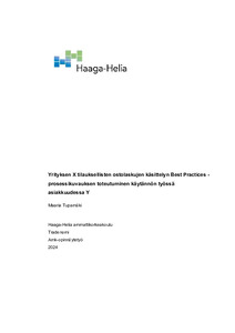 Opinnäytetyön tavoitteena oli tutkia yritys X:lle taloushallintopalvelunsa ulkoistaneen asiakas Y:n tilauksellisten ostolaskujen manuaalisen käsittelyprosessin toteutumista. Tutkimuksen toimeksiantajana toimi yritys X, joka oli havainnut prosessissa esiintyvän poikkeamia. Näistä prosessipoikkeamista haluttiin saada syvempi ymmärrys, jotta prosessia voidaan kehittää tehokkaasti.