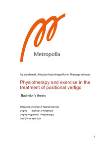 The aim of this thesis was to describe the effects of physiotherapy and exercise in treatment of positional vertigo. Scholarly articles with various types of methodologies such as randomised controlled trials, clinical trials, descriptive case series and Cochrane reviews were used in describing the effects of these two treatments. An extensive search strategy was carried out across four different types of databases, PubMed, ScienceDirect, ProQuest and CINAHL, where five most relevant articles were selected in executing this bachelor’s thesis. Study findings from all the selected articles demonstrated positive results regarding the effectiveness of physiotherapy interventions in alleviating symptoms and reducing recurrence rates in patients with positional vertigo. In the study that used vestibular exercises, findings reported significant improvements in symptom resolution, nystagmus resolution, and balance post-treatment. The incorporation of vestibular exercises alongside repositioning manoeuvres was associated with enhanced treatment efficacy and reduced recurrence rates. Repositioning manoeuvres and exercise are two of the most common physiotherapy interventions that are used in the treatment of positional vertigo and the studies utilised in this bachelor's thesis proved their effectiveness in treating various types of positional vertigo in terms of the canal affected.