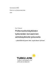 Tämän opinnäytetyön tavoitteena oli teettää tutkimus toimeksiantajalle rakennustyömaan polttomoottorikäyttöisten työkoneiden hiilidioksidipäästöistä sekä niiden vähentämisestä työkoneiden sähköistämisellä. Tällä pyritään selvittämään toimeksiantajan mahdollisuudet työmaidensa polttomoottorikäyttöisten koneiden korvaamiseen lähtökohtaisesti sähkökäyttöisillä laitteilla. Työn toimeksiantaja on Turun Kaupunki.