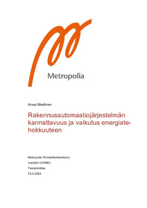 Työssä tutkittiin rakennusautomaatiojärjestelmän vaikutusta energiatehokkuuteen ja määritettiin investointilaskelmilla rakennusautomaatiojärjestelmän taloudellinen kannattavuus esimerkkirakennusten avulla. Esimerkkirakennuksina työssä käytettiin toimisto- ja asuinrakennuksia.