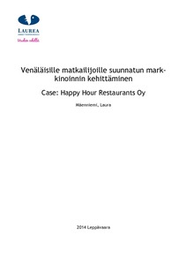 Tämän opinnäytetyön tarkoituksena oli kehittää helsinkiläisen ravintolayrityksen Happy Hour Restaurants Oy:n kansainvälistä markkinointia. Kohteena olivat Venäjältä Helsinkiin saapuvat matkailijat. Työn tavoitteena oli sekä kerätä tietoa venäläisten matkailutottumuksista Helsingissä että luoda lista venäläisistä matkanjärjestäjistä, jotka tuovat matkailijoita Venäjältä Suomeen. Listan tuli sisältää kuvaus matkanjärjestäjän toiminnasta ja yhteystiedot.