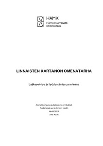 Hyödyntämissuunnitelmaa varten sadosta tehtiin 230 kilon koe-erä mehua ulkopuolisella puristamolla sekä pieni erä sosetta itse. Koe-eriin oltiin tyytyväisiä. Lisäksi tarhalle tehtiin hoitosuunnitelma. Omenatarhan kaupallista hyödyntämistä ei päädytty kehittämään eteenpäin. Omenatarhan kaupallinen viljely vaatii panostuksia sekä suunnitelmallisuuteen että ulkopuoliseen työvoimaan, eikä siihen tällä hetkellä ole vaadittavia resursseja. The thesis was commissioned by Juhani Lipsanen’s estate, whose possession the apple orchard of Linnaisten kartano is in. The apple orchard is in Vantaa, in growth zone 1b. There are roughly 40 apple trees in the apple orchard, and the features of the trees vary greatly. The goal of the thesis was to find a proper way to use the crop privately and clarify the requirements of commercial use. In addition, the cultivars existing in the apple orchard were examined.