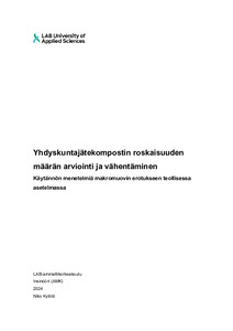 Opinnäytetyön tarkoituksena oli selvittää Labio Oy:n kompostituotteen sisältämän muoviroskan määrä ja verrata tuloksia tuleviin roskaisuuden raja-arvojen lakimuutoksiin. Työssä käytettiin roskaisuuden analysointiin samaa CENT/TS 16202:2013 standardimenetelmää, mitä Ruokavirasto käyttää. Menetelmästä laadittiin Labio Oy:n tuotteelle sopiva käytännöllinen työohje.