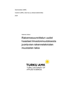 Tämä opinnäytetyö on kirjallisuuskatsaus ilmastonmuutoksen vaikutuksista tulevaisuuden ympäristössä. Kirjallisuuskatsauksessa uppouduttiin erityisesti siihen, miten rakennesuunnittelijan työ tulee muuttumaan sään eri ääri-ilmiöiden yleistyessä ja miten rakennesuunnittelija voi työssään huomioida nämä. Tavoitteena oli perehtyä rakennesuunnittelijan näkökulmasta erilaisiin toimenpiteisiin, joiden avulla rakennusala voisi saavuttaa hiilineutraaliustavoitteensa vuoteen 2035 mennessä, jolloin myös koko Suomen tavoite on olla hiilineutraali. Tavoitteena oli myös tarkastella vuonna 2025 voimaan astuvan rakennuslain sisältöä ja miten rakentamislaki tulee vaikuttamaan rakennesuunnittelijan työnkuvaan.