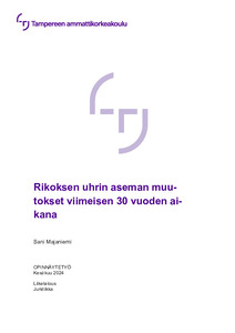 Tässä opinnäytetyössä käsitellään rikoksen uhrin aseman muutosta viimeisen 30 vuoden aikana sekä pohditaan uhrin tukipalveluiden merkitystä uhrin asemaan. Rikoksen uhrin asema oli hyvin erilainen 30 vuotta sitten, jolloin vastaavia tukipalveluita ei ole ollut saatavilla. Opinnäytetyössä on otettu tarkasteluun uhrin aseman parantumiseen, uhrin suojeluun ja uhrille tarjottaviin tukipalveluihin vaikuttaneet säädökset, muun muassa laki lähestymiskiellosta, Istanbulin sopimus, Euroopan parlamentin direktiivi 2012/29/EU ja esitutkintalaki.