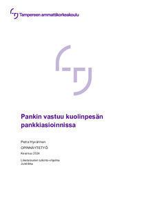 Opinnäytetyön tarkoituksena oli tutkia pankin vastuun määräytymistä kuolinpesän pankkiasioiden hoidossa ja siihen liittyviä oikeudellisia toimia. Tarkoituksena oli selvittää, mikä on pankin ja kuolinpesän yhteishallinnon vastuu kuolinpesän eri vaiheissa pankkiasioinnin osalta ja miten vastuunjako määräytyy. Kiinnostus opinnäytetyön tutkimusaiheeseen on peräisin tekijän henkilökohtaisesta työstä kuolinpesän pankkiasioiden parissa ja eteen tulleista vastuunrajauskysymyksistä kuolinpesien parissa.
