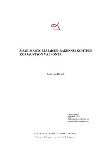 Opinnäytetyön tavoite oli tutkia ja selvittää sisäilmaongelmaisen kohteen rakennustyön valvontaa kokonaisprosessina. Työn tuloksena saadaan sisäilmaongelmaisen korjauskohteen prosessikuvaus ja käytännön toiminta-ohjeet korjausrakentamisen rakennustöiden valvojille. Kaikki opinnäytetyön toteutuksessa olevat hankkeet ovat opinnäytetyön laatijan valvontatyökohteita vuosien varrelta, hankkeet ovat asuinkerrostaloja, päiväkoteja, sosiaali- ja terveydenhuollon toimitiloja ja toimistorakennuksia Tampereen talousalueelta.