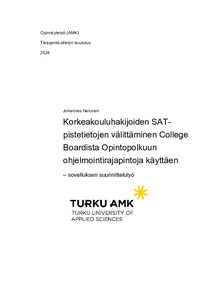 Turun ammattikorkeakoulun hakijapalveluilla oli tarve saada SAT-pisteiden vienti Opintopolkuun automatisoitua, sillä aiemmin tämä prosessi hoidettiin käsin. Tämän opinnäytetyön tavoitteena oli suunnitella hakijapalveluille sovellus, joka hakee College Boardin järjestelmästä korkeakouluhakijan SAT-pistetiedot, jotka välitetään Opintopolun järjestelmään ohjelmointirajapintoja käyttäen.