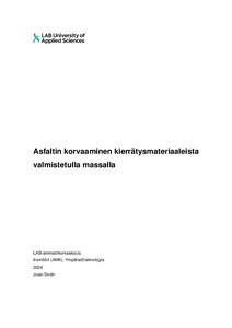 Opinnäytetyössä selvitettiin asfalttijätteen ja kierrätetyn kattohuovan käyttöä asfaltin kaltaisen massan valmistamisessa kiertotalousalueen käsittelykentälle. Työssä selvitettiin kierrätysmateriaaleista valmistettavan massan hyödyt ympäristönäkökulmasta verrattuna neitseelliseen asfalttiin. Toimintaa varten tehtiin ympäristönsuojelulain mukainen koetoimintailmoitus.