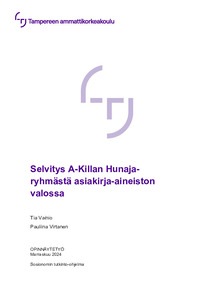 Opinnäytetyö toteutettiin yhteistyössä A-Killan Hunaja-ryhmän kanssa. Työn tarkoituksena oli kuvailla Hunaja-ryhmän toiminnan vaikutuksia päihdetoipujien elämään. Tutkimuksen tavoitteena oli tuottaa asiakirja-aineiston pohjalta tietoa siitä, missä Hunaja-ryhmä onnistuu ja mitä toiminnassa voidaan kehittää ja kohdentaa paremmin päihdetoipujien tarpeisiin. Lisäksi pyrkimyksenä oli lisätä yleistä ymmärrystä siitä, kuinka vertaistukeen ja yhteisöllisyyteen perustuvat kuntoutusmallit voivat tukea asiakkaiden toipumista ja sosiaalista integroitumista.