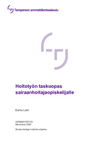 Opinnäytetyön tarkoituksena oli luoda erityisesti sairaanhoitajaopiskelijoille tarkoitettu taskuopas, jossa on hoitotyön keskeisimmät ja tärkeimmät asiat tiiviissä ja kattavassa muodossa. Opinnäytetyöprosessissa selvitettiin, mitkä ovat sairaanhoitajaopiskelijalle oleellisimmat asiat, jotka oppaaseen sijoitetaan. Tämän opinnäytetyön tavoitteena on tarjota sairaanhoitajaopiskelijoille työväline, jolla he voivat lisätä omaa varmuuttansa työskentelyyn, tukea opiskelijan oppimista ja näin ollen tarjota potilaille mahdollisimman laadukasta hoitoa.