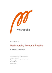 The objective of this thesis is to create a plan for backsourcing outsourced accounts payable (A/P) services for the case company based in Finland, as part ofunifying operating methods across the group of the case company. The thesis explores the current A/P process of the case company, investigates how other units manage their in-house A/P, and gathers best practices. Based on these insights, the thesis develops a backsourcing plan with key development ideas.