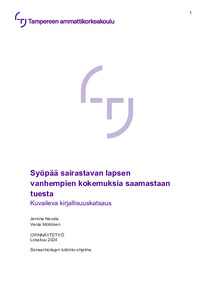 Opinnäytetyön tarkoituksena oli kirjallisuuskatsauksen keinoin kuvata sitä, millaisia kokemuksia syöpää sairastavan lapsen vanhemmilla on saamastaan tuesta. Opinnäytetyössä vastattiin tutkimuskysymykseen, millaisia kokemuksia syöpälapsen vanhemmilla on saamastaan tuesta? Katsauksen tavoitteena oli selvittää, miten tuloksia voitaisiin hyödyntää esimerkiksi hoitotyön opetuksessa, jotta tulevaisuudessa hoitoalan työntekijät osaisivat tarjota lapsen vanhemmille laadukasta ja riittävää tukea.