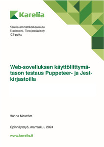 Opinnäytetyön aiheena oli web-sovelluksen käyttöliittymätason testaus Puppeteer-kirjastolla ja Jest-viitekehyksellä ja opinnäytetyön tavoitteena oli tutkia Puppeteerin ja Jestin yhteiskäyttöä sekä niillä toteutettua käyttöliittymätason testausta web-sovellukseen. Käyttöliittymätason testaus on oleellinen osa ohjelmistokehitystä ja käyttäjän sekä liiketoiminnan näkökulmasta on tärkeää, että sovellus toimii kuten on määritelty.