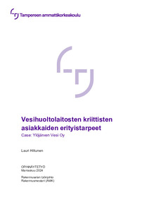 Opinnäytetyössä tarkastellaan vesihuollon kriittisten asiakkaiden erityistarpeita, jotta vesihuoltolaitos kykenisi paremmin ottamaan asiakkaat omassa varautumisessa huomioon. Tavoitteena on myös lisätä kriittisten asiakkaiden omaa varautumista. Työn salassa pidettävä osuus on Ylöjärven Vesi Oy:n päivitetty kriittisten asiakkaiden liite. Kriittisen infran sekä asiakastietojen suojelemiseksi asioita käsitellään julkisessa osiossa yleisesti.