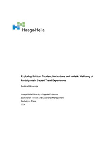 The results of this research indicate that the interviewees were driven by a variety of different personal motives, such as desire for personal growth, desire for answers on life’s big questions and curiosity to learn about cultural or religious practises. The journeys were characterized by different activities such as meditations and rituals, and they typically took place natural or other spiritually or culturally significant settings. The outcomes of the interviews revealed positive aspects on emotional wellbeing, such as clarity on life, new perspective, improved self-awareness and deeper connection with others as well as possible improvements on physical wellbeing. These findings suggest that spiritual tourism experiences positively contribute to holistic wellbeing. Matkailuala kehittyy jatkuvasti, ja erilaisten erikoismatkailun muotojen suosio on kasvussa. Immersiivisten ja transformatiivisten kokemusten kautta on mahdollista merkittävästi edistää yksilön hyvinvointia. Tämä tutkimus tarkastelee henkiseen matkailuun osallistuneiden henkilöiden motiiveja, matkojen ominaispiirteitä sekä niiden vaikutuksia kokonaisvaltaiseen hyvinvointiin. Tutkimuksen päätavoitteena on ymmärtää, miten tällaiset matkat vaikuttavat yksilöiden hyvinvointiin. Tarkempina tavoitteina ovat matkoille lähtijöiden motivaatiotekijöiden tunnistaminen sekä matkakohteiden, niissä tapahtuvien aktiviteettien ja matkojen kestojen selvittäminen.