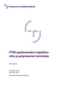Opinnäytetyö tehtiin Tampereen ammattikorkeakoulun kemian laboratorioon osana uusien FTIR-spektrometrien käyttöönottoa. Työn tavoite oli kehittää kemian laboratorion FTIR-yksikön toimivuutta ja luoda opetusympäristöstä sujuvampi, eli tarkoitus oli laatia FTIR-laitteelle käyttöohjeet opetuskäyttöön. Tavoitteeksi muodostui myös koota tietoa, joka auttaa hahmottamaan FTIR-spektroskopian kokonaiskuvaa, ja tuottaa sisältöä, joka voi olla tukimateriaalina esimerkiksi spektrien tulkinnassa. Työn toisena tarkoituksena oli tehdä mittauksia polymeerinäytteistä ja tulkita niiden mittaustuloksia.