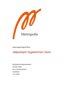 Tämä insinöörityö tehtiin Espoon seudun ympäristöterveydelle, joka toteutti vuonna 2024 Jääpalojen hygieeninen laatu -projektin. Insinöörityön tavoitteena oli tutkia satunnaisesti valittujen Espoon seudun ympäristöterveyden valvonta-alueella toimivien tarjoilupaikkojen sekä hyväksyttyjen elintarvikehuoneistojen jääpalojen tai jäähileiden mikrobiologista laatua. Kohteissa otettiin myös jäätä valmistavasta koneesta ja kauhasta pintapuhtausnäytteitä. Lisäksi laadittiin sähköinen kyselytutkimus, jonka tavoitteena oli kartoittaa jääpalojen hygieeniseen laatuun vaikuttavia tekijöitä.