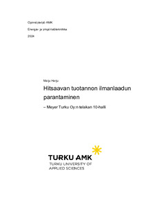 Ilmanlaatumittauksista saadut tulokset ylittivät ilmanlaadulle asetetut raja-arvot. Ilmanlaatua hallissa voitaisiin parantaa tehokkaan kohdepoiston ja hyvän yleisilmanvaihtoa avulla. Hitsaushuurujen pitoisuuksien alentaminen asetettuihin raja-arvoihin luo edellytykset turvalliselle, terveelliselle ja viihtyisälle sisäilmalle. The thesis examined whether the indoor air quality in the Meyer Turku Oy hall 10 meets the set target levels. The processes in the hall generate welding fumes, which are harmful to human health. The purpose of the thesis was to investigate the harmfulness and concentration of the welding fumes. Air quality was measured by Kemper AirWatch air quality meters. Based on the obtained measurement results, the goal was to present recommendations for further actions. The thesis was commissioned by the shipbuilding company Meyer Turku Oy.