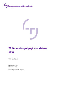 Tämä opinnäytetyö on suunnattu ensihoitajaopiskelijoille sekä ensihoidon ammattilaisille 791A-tehtävälle. Opinnäytetyön tilaaja on Tampereen Ammattikorkeakoulu. Opinnäytetyö koostuu teoreettisesta kirjallisesta raportista sekä lopullisesta tuotoksesta. Raportissa on selvitetty vastasyntyneen fysiologiaa sekä vastasyntyneen ennusteeseen vaikuttavia ensihoitotoimia. Tuotoksena syntynyt tarkistuslista on laadittu etsimällä tutkittua tietoa sen toteuttamisesta. Tarkistuslista on opinnäytetyön tuotos, sillä se tutkitusti parantaa potilasturvallisuutta.