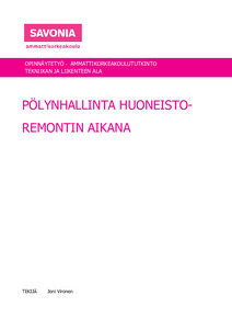 Tämän opinnäytetyön aiheena oli pölynhallinta huoneistonremontin aikana. Tarkoituksena oli sekä oma että toimeksiantajayrityksen tarve kehittää pölynhallintaa, jotta päästäisiin mahdollisimman pölyttömiin työmaaolo-suhteisiin Työn tavoitteena oli muodostaa yhtiön käyttöön uudet nykyaikaiset ohjekortit, jotka saataisiin tukemaan pölynhallintasuunnitelmaa sekä työhön perehdytystä.