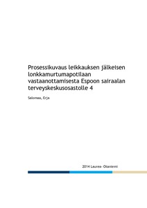 Tämän toiminnallisen opinnäytetyön tarkoitus oli tuottaa prosessikuvaus traumaattisen matalaenergisen lonkkamurtumapotilaan vastaanottamisesta leikkauksen jälkeiseen kuntoutukseen, lonkkaliukumäkeen, Espoon sairaalan terveyskeskusosastolle 4.Potilaan vastaanottaminen, hoito ja kuntoutus sekä kotiutuminen perustuvat eri yksiköiden sekä moniammatillisen tiimin yhteistyöstä.