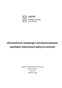 Tämän opinnäytetyön aiheena oli selvittää Hämeenlinnan kaupungin varhaiskasvatuksen opettajien kokemuksia työhyvinvoinnista varhaiskasvatuksessa. Tutkimuksellisen opinnäytetyön tarkoituksena oli tuottaa tietoa Hämeenlinnan kaupungille työnantajana siitä, kuinka varhaiskasvatuksen opettajat kokevat oman työhyvinvointinsa. Tavoite oli selvittää, minkälaisena varhaiskasvatuksen opettajat kokevat työhyvinvointinsa, millaisia haasteita siinä oli tai millaisia työhyvinvointia tukevia asioita voitiin löytää. Lisäksi tavoitteena oli selvittää, millaisia tukitoimia ja parannuksia voitiin työntekijöiden mielestä toteuttaa työhyvinvoinnin edistämiseksi varhaiskasvatuksessa. Tutkimuskysymyksinä olivat, mitkä tekijät vaikuttavat varhaiskasvatuksen opettajien työhyvinvointiin heidän kertomanaan sekä mitä parannuksia varhaiskasvatuksen opettajat ehdottavat työhyvinvoinnin lisäämiseksi. Opinnäytetyön toimeksiantajana toimi Hämeenlinnan kaupunki.