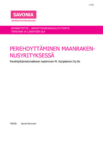 Opinnäytetyön tavoitteena oli selvittää yrityksen tämänhetkiset perehdytyskäytännöt sekä työturvallisuuden tila. Työn tarkoituksena oli laatia yritykselle kirjallinen perehdytyslomake, jonka avulla yhtenäistetään pereh dytyksen sisältöä ja laajuutta. Tähän mennessä yrityksellä ei ole ollut kirjallista perehdytyslomaketta, jonka takia perehdytykset on toteutettu suullisesti, eikä perehdytyksen suorittamisesta ole laadittu kirjallista dokumenttia.