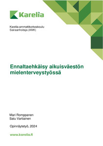 Tämän opinnäytetyön tavoite on lisätä opiskelijoiden ymmärrystä aikuisten ehkäisevästä mielenterveystyöstä. Opinnäytetyömme tehtävänä on tuottaa podcast aikuisten ehkäisevästä mielenterveystyöstä. Podcastia käytetään opetuksen tukena opetusmateriaalina. Opiskelijan on tarkoitus kuunnella podcast ja perehtyä muihin materiaaleihin. Podcast tulee osaksi mielenterveys- ja päihdetyön syventäviä opintoja ja sen tarkoituksena on auttaa opiskelijoita ymmärtämään mitä ehkäisevä mielenterveystyö on. Opinnäytetyössä keskitymme avaamaan ehkäisevän mielenterveystyön keskeisiä käsitteitä kuten promootio ja preventio sekä ehkäisyn tasoja. Tuomme työssämme esiin ehkäisevän mielenterveystyön toimijoita sekä miten kukin voi omalla toiminnallaan vaikuttaa omaan mielenterveyteen. Jotta ihminen vaikuttaisi omaan mielenterveyteensä tulisi vahvistaa suojaavia tekijöitä ja vähentää tai poistaa haavoittavia tekijöitä. Ihmisen terveys koostuu monesta asiasta, siihen kuuluu fyysinen, sosiaalinen ja henkinen tila. Ehkäisevällä mielenterveystyöllä pyritään edistämään hyvinvointia. Hyvinvointiin kuuluu terveys, itsensä toteuttaminen, hyvä elämänlaatu, sosiaaliset suhteet sekä toimeentulo. Vahvuudet ja voimavarat ovat olennaisessa osassa, kun mietitään ihmisen hyvinvointia. Suomessa hyvinvointi tarkoittaa sekä yksilö sekä yhteisötason hyvinvointia. Ihmisen elämäkaari lapsuudesta aikuisuuteen muovaa mielenterveyden kehittymistä. Opinnäytetyössä korostetaan ihmisen omaan toimintaa mielenterveyden hyväksi sekä sitä, miten ihminen voi ennaltaehkäistä mielenterveyden haasteita.