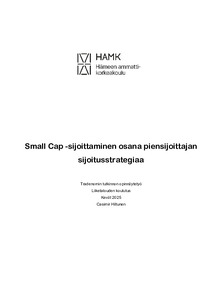 Opinnäytetyön tavoitteena oli selvittää miten ja miksi piensijoittajat sijoittavat Small Cap -yhtiöihin, sekä miksi pienyhtiöihin sijoittamista kannattaa harkita. Opinnäytetyön aihe syntyi kiinnostuksesta osakesijoittamista kohtaan sekä sijoittamisen ajankohtaisuudesta. Osakesijoittaminen on Suomessa tällä hetkellä suositumpaa kuin koskaan ja pienyhtiösijoittaminen on aiemmin osoittautunut toimivaksi strategiaksi erityisesti taloudellisten taantumien jälkeen.