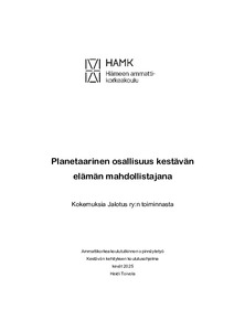 Elämme yhteisellä rajallisella planeetalla, jonka olennot ja järjestelmät muodostavat toisiinsa kietoutuneen kokonaisuuden. Elinmahdollisuuksiamme uhkaavan ekologisen kriisin ratkaisemiseksi meidän tulee hahmottaa yhteytemme ja tekojemme vaikutukset muihin ihmisiin ja luontokappaleisiin lähellä ja kaukana. Planetaarisen osallisuuden kokemus on uusi määritelmä tämän keskinäisriippuvuuden tunnistavalle näkökulmalle, josta kestävään elämäntapaan sitoutuminen kumpuaa. Tämän opinnäytetyön tilaaja oli Jalotus ry, Suomen merkittävin kestävän elämän liike, joka työskentelee kansalaisia osallistamalla kohti matalapäästöistä ja sosiaalisesti oikeudenmukaista tulevaisuutta. Tavoite oli tutkia Jalotuksen hankkeeseen osallistuneiden kokemusta heidän planetaarisesta osallisuudestaan sekä selvittää, miten heidän kokemuksensa mukaan hankkeeseen osallistuminen on siihen vaikuttanut. Tämä opinnäytetyö laajensi ymmärrystä Jalotuksen kestävän elämäntavan osallisuusohjelma -hankkeen vaikuttavuudesta ja toi käyttökokemusta uudesta mittarista, planetaarisen osallisuuden indikaattorista.