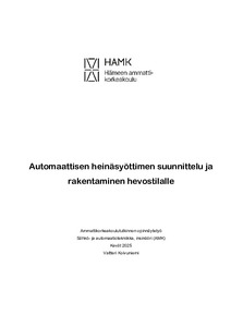 Tämä opinnäytetyöraportti käsittelee automaattisen heinänsyöttöjärjestelmän suunnittelua ja toteutusta. Opinnäytetyön toimeksiantajana toimi Janakkalassa sijaitseva hevostila, Koivuniemen Talli. Projektin taustalla oli halu toteuttaa toimiva automaatiojärjestelmä, joka toisi konkreettista hyötyä käyttäjilleen. Tämän lisäksi haluttiin tutustua tarkemmin varsinkin pienjärjestelmien sähkösuunnitteluun, ja PLC-ohjainten hyödyntämismahdollisuuksiin tämänkaltaisissa projekteissa.