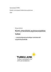 Opinnäytetyön tavoitteena oli luoda asiantuntijasairaanhoitajan toimintamalli, joka yhtenäistää psykososiaalisen tuen käytäntöjä Tyksin syöpää hoitavissa yksiköissä. Opinnäytetyö toteutettiin Läntisen Syöpäkeskuksen toimeksiantona. Sen tutkimuksellisessa osuudessa käytettiin teemahaastatteluihin perustuvaa laadullista tutkimusta ja haastattelut toteutettiin ryhmähaastatteluina. Aineisto analysoitiin sisällönanalyysillä.