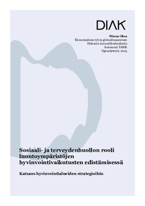 Tässä opinnäytetyössä selvitettiin hyvinvointialuestrategioiden ja alueellisten hyvinvointisuunnitelmien pohjalta, kuinka luontoympäristöjen hyvinvointivaikutukset todentuvat osana sosiaali- ja terveyspalveluita ja mikä on sosiaali- ja terveysalan rooli luontoympäristön hyvinvointivaikutusten edistämisessä. Sisällönanalyysia hyödyntäen aineisto tiivistyi neljään pääteemaan, joissa painopiste oli luontoympäristöjen hyvinvointivaikutusten huomioimisena osana palveluiden kehittämistä, sekä osana hyvinvoinnin määrittelyä. Osallisuus vaikuttavien ennaltaehkäisevien palveluiden kehittämisessä, kestävän kehityksen toteutuminen, sekä ekososiaalinen sivistys näkyvät läpileikkaavina ilmiöinä luontoympäristöjen hyvinvointivaikutusten edistämisessä.